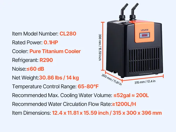 Chłodziarka/grzałka do wody akwariowej VEVOR 200L z pompą wodną o wysokim przepływie, sprężarką, parownikiem tytanowym, kompletnym wyposażeniem, szybkie chłodzenie akwarium, aksolotla i rafy koralowej