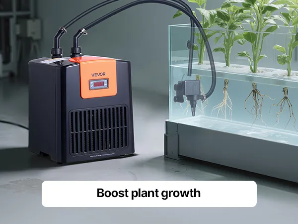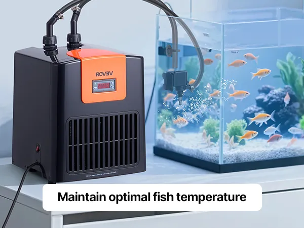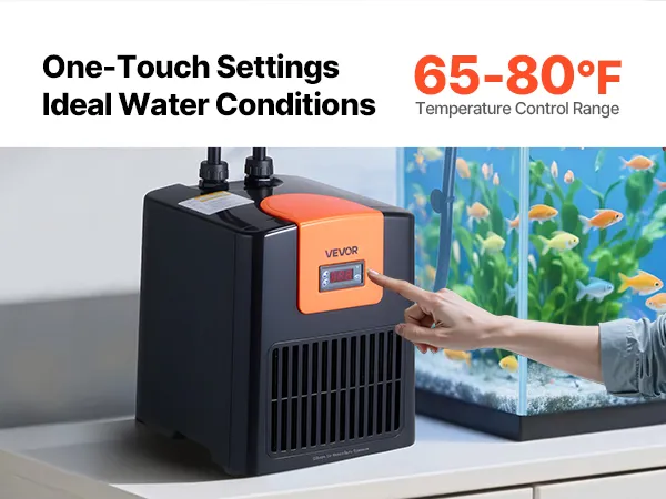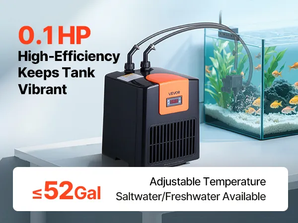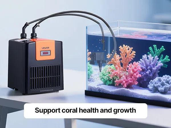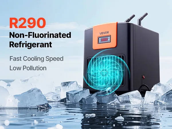 Chłodzenie o wysokiej wydajności 0,1 KM: Ta chłodziarka i grzałka do akwarium wykorzystuje sprężarkę bezfluorową i czynnik chłodniczy R290, co zapewnia wydajne chłodzenie. Utrzymuje temperaturę wody do 27°C.