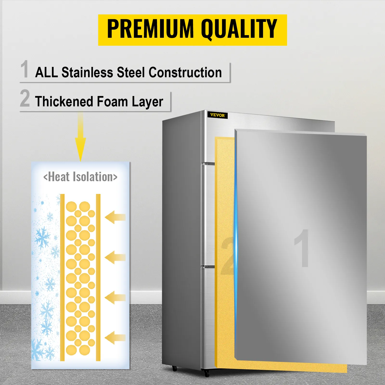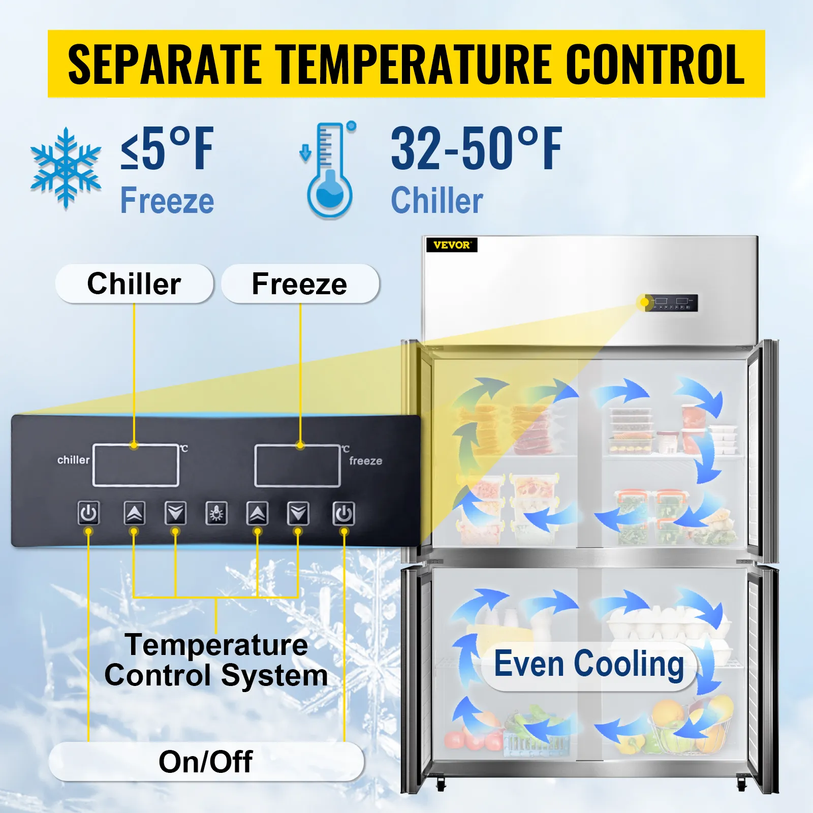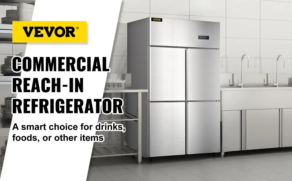 Dzięki profesjonalnej lodówce VEVOR najważniejsze artykuły spożywcze i napoje zawsze będą świeże i gotowe dla Twoich klientów. Dzięki dużej przestrzeni do przechowywania, eleganckiemu wyglądowi, oddzielnym ustawieniom temperatury, efektywnemu chłodzeniu i cichej sprężarce, nasza lodówka jest absolutnie właściwym wyborem dla Twojej firmy. VEVOR, oferujemy Ci rozwiązanie.
