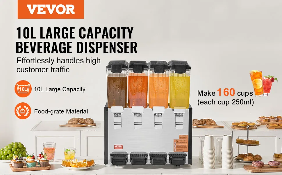 Duża pojemność: Ten komercyjny dystrybutor napojów wyposażony jest w 10-litrowy zbiornik i może pomieścić dużą ilość napojów. Zapewnia niezawodne dozowanie zimnych napojów i z łatwością obsługuje ruch klientów. Gumowa uszczelka zapobiega wyciekaniu napojów.