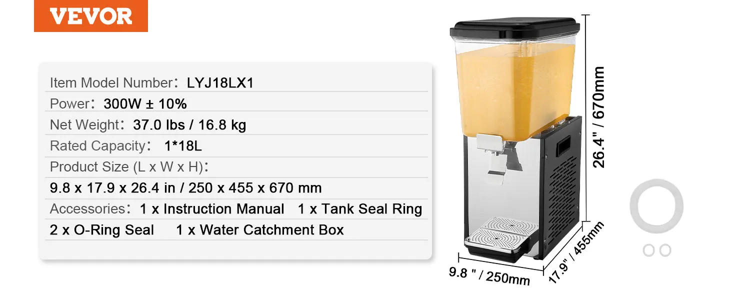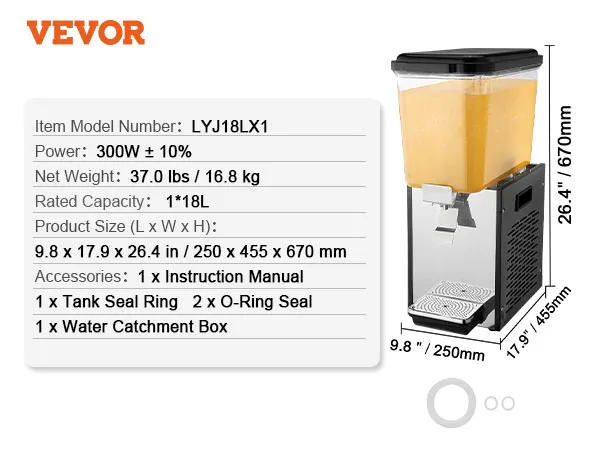 Duża pojemność: Ten komercyjny dystrybutor napojów wyposażony jest w zbiornik o pojemności 18 litrów i może pomieścić dużą ilość napojów. Zapewnia niezawodne dozowanie zimnych napojów i z łatwością obsługuje ruch klientów. Gumowa uszczelka zapobiega wyciekaniu napojów.