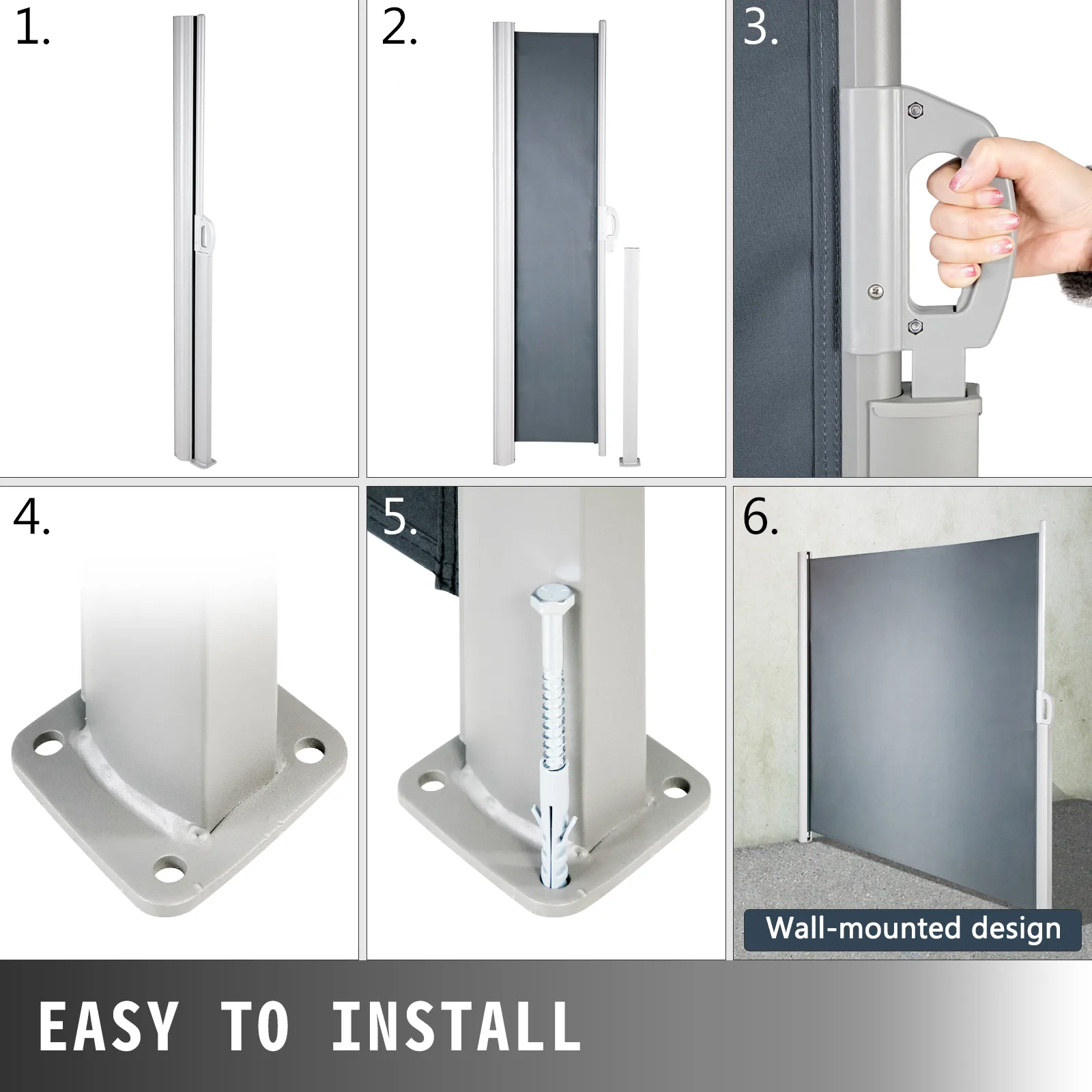 Konfiguracja ekranu prywatności to proste zadanie. Nie potrzebujesz eksperta od projektów DIY, aby wykonać tę markizę. Pudełko zawiera wszystkie niezbędne części i akcesoria. Instrukcje są jasne i łatwe do wykonania bez zamieszania. Możesz współpracować z drugą osobą, aby szybciej i wydajniej skonfigurować przegrodę pokojową. Po zainstalowaniu markizy będziesz ją łatwo obsługiwać. Posiada chowany uchwyt. Możesz wysuwać i zsuwać ekran bez żadnych problemów. Uchwyt ma gładką sprężynę, która umożliwia łatwe wysuwanie ekranu.