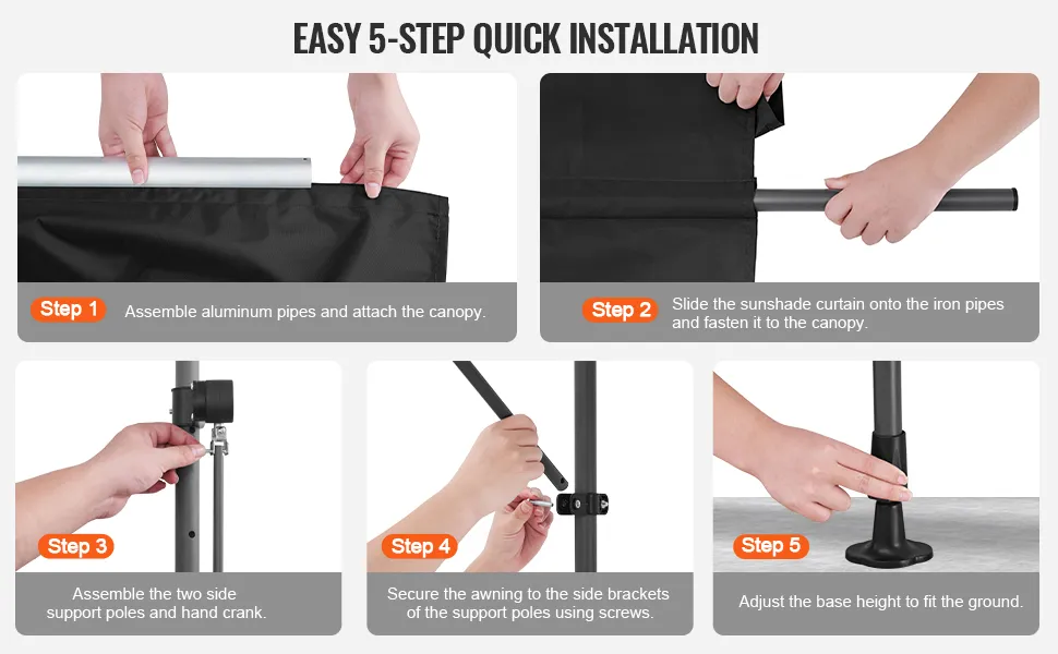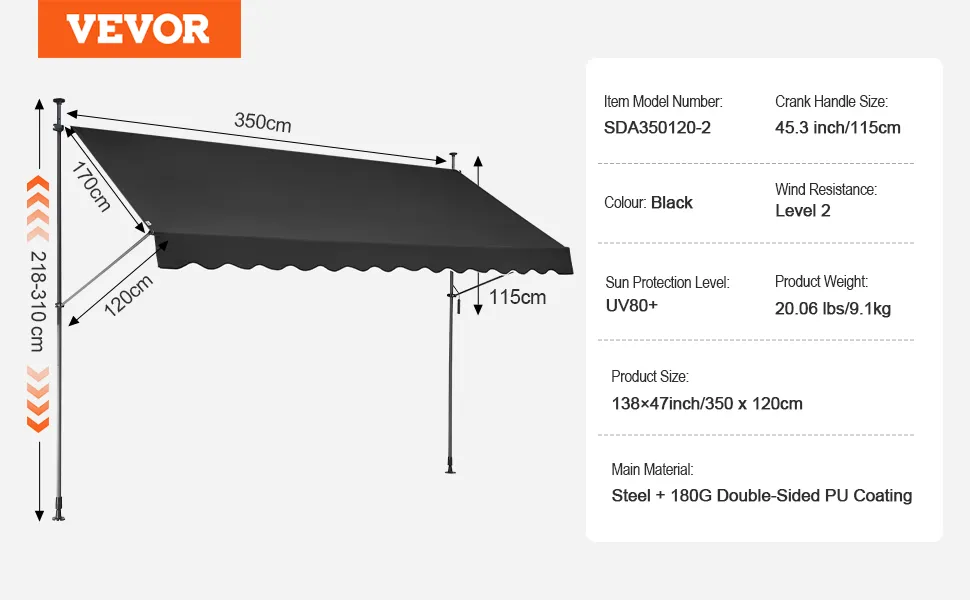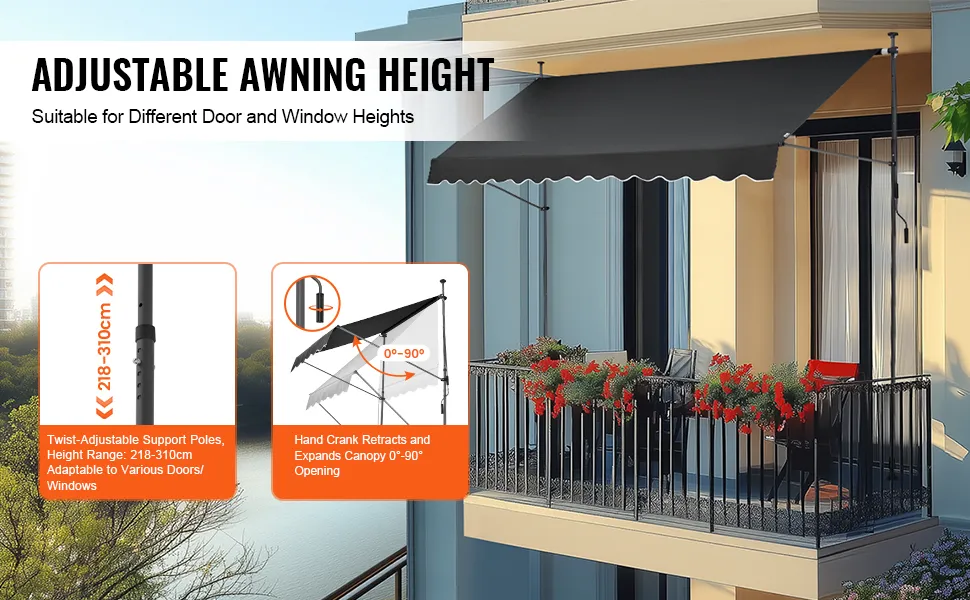 Łatwa regulacja: Ta ręcznie zwijana markiza może być regulowana na wysokość w zakresie od 218 do 309 cm, aby dopasować się do drzwi i okien o różnej wysokości. Zapewnia to elastyczność w aranżacji przestrzeni zewnętrznej.