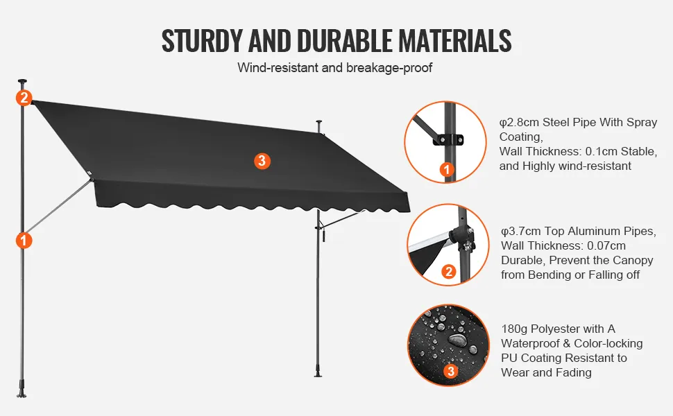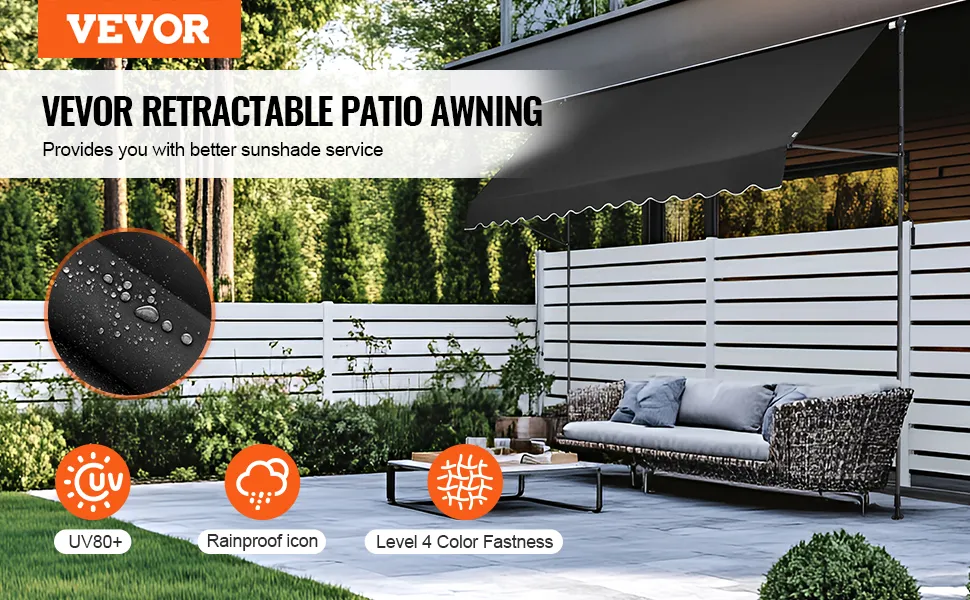 Ochrona przed słońcem i wodoodporność: Nadal zmagasz się z letnim upałem? Ta duża, zwijana markiza tarasowa (350 x 120 cm) ma wodoodporną powłokę poliuretanową o gramaturze 180 g z trwałym wykończeniem koloru i oferuje ochronę UV80+, dzięki czemu idealnie nadaje się do relaksu na tarasie.