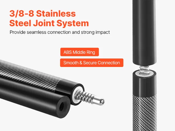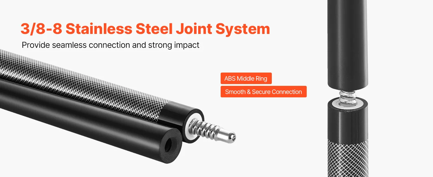 Bezspoinowe łączenie: Ten zestaw kijów bilardowych wyposażony jest w system łączenia ze stali nierdzewnej 3/8-8, zapewniający ścisłe i bezszwowe połączenie. Matowe wykończenie łączenia zapewnia wygodny, antypoślizgowy chwyt, a pierścień centralny ABS dodaje elegancji i eleganckiego wyglądu.