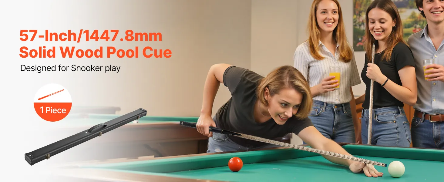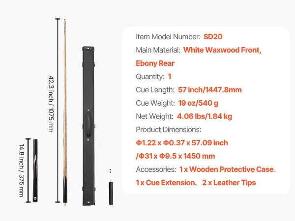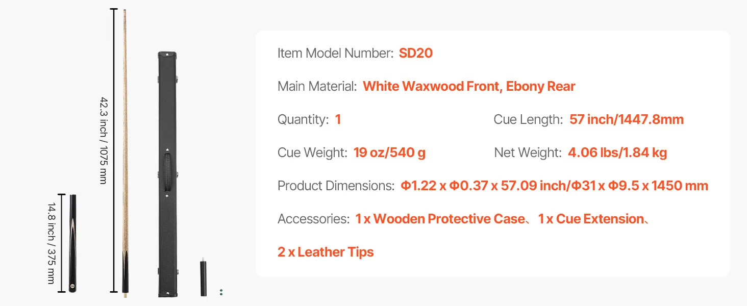 Kij bilardowy VEVOR (1447,8 mm / 540 g) z trzonkiem przedłużającym, skórzaną końcówką i drewnianym etui; odpowiedni do profesjonalnych stołów bilardowych, barów, domu i biura