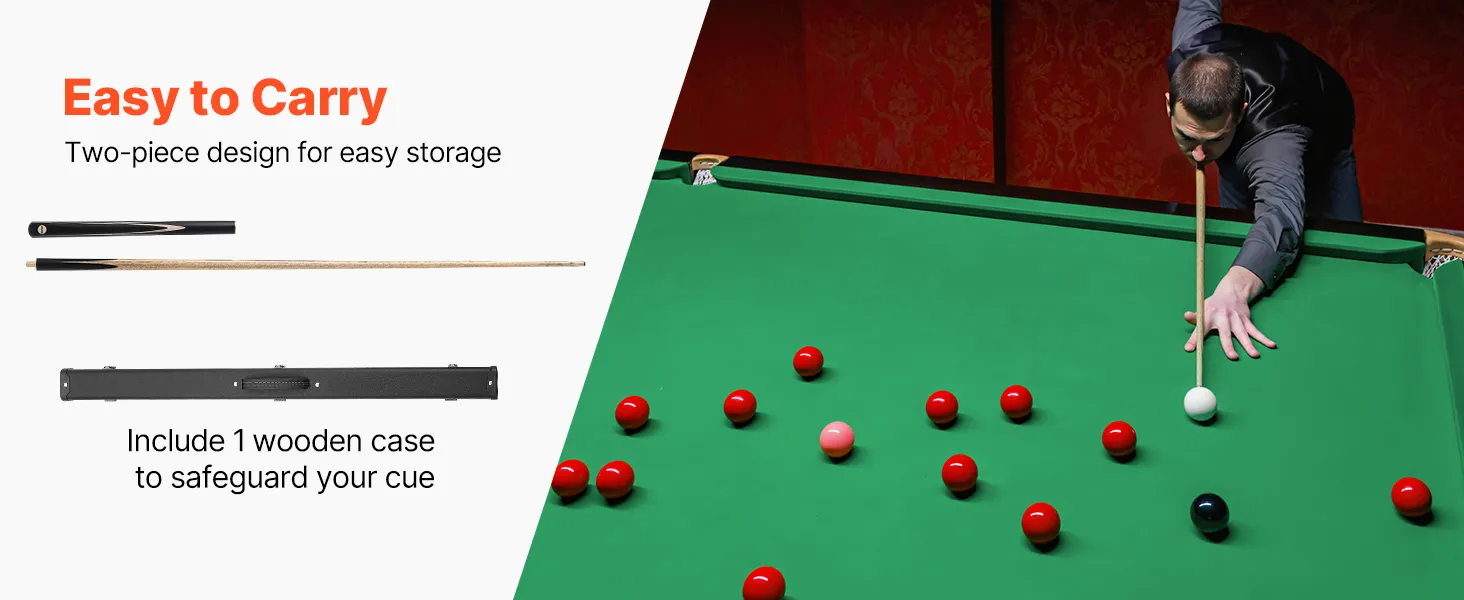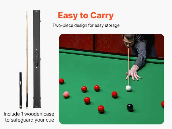 Dzięki dwuczęściowej konstrukcji, kij snookerowy VEVOR z przegubem jest łatwy w przechowywaniu i zajmuje niewiele miejsca. W zestawie znajduje się praktyczne drewniane etui, które pozwala na wygodny transport kija do pokoju gier lub strefy rozrywki.