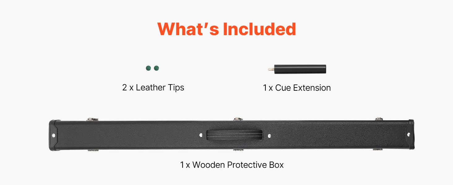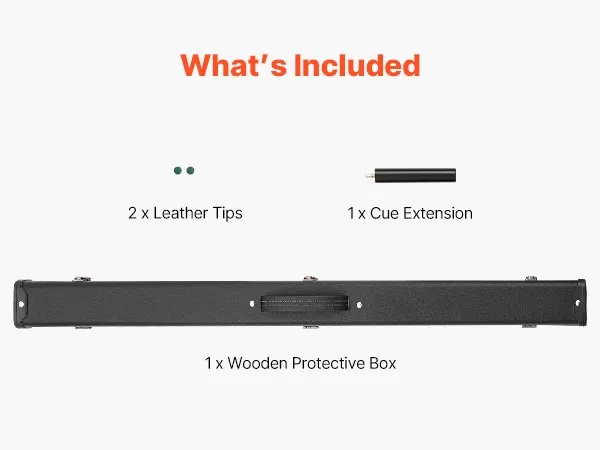 Otrzymasz: 1 x drewniane etui, 1 x przedłużkę, 2 x skórzane końcówki. Ten zestaw kijów bilardowych to doskonały prezent dla początkujących i zawiera wszystko, czego potrzebujesz na początek.
