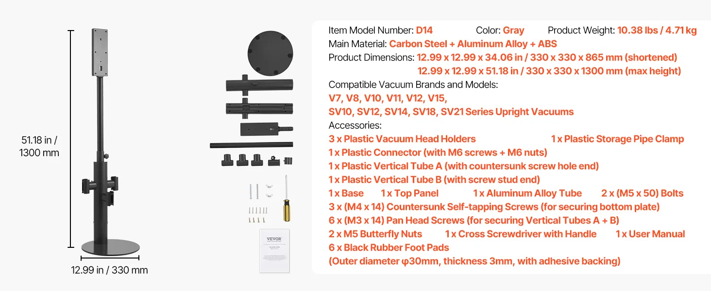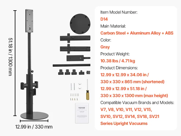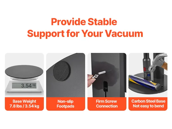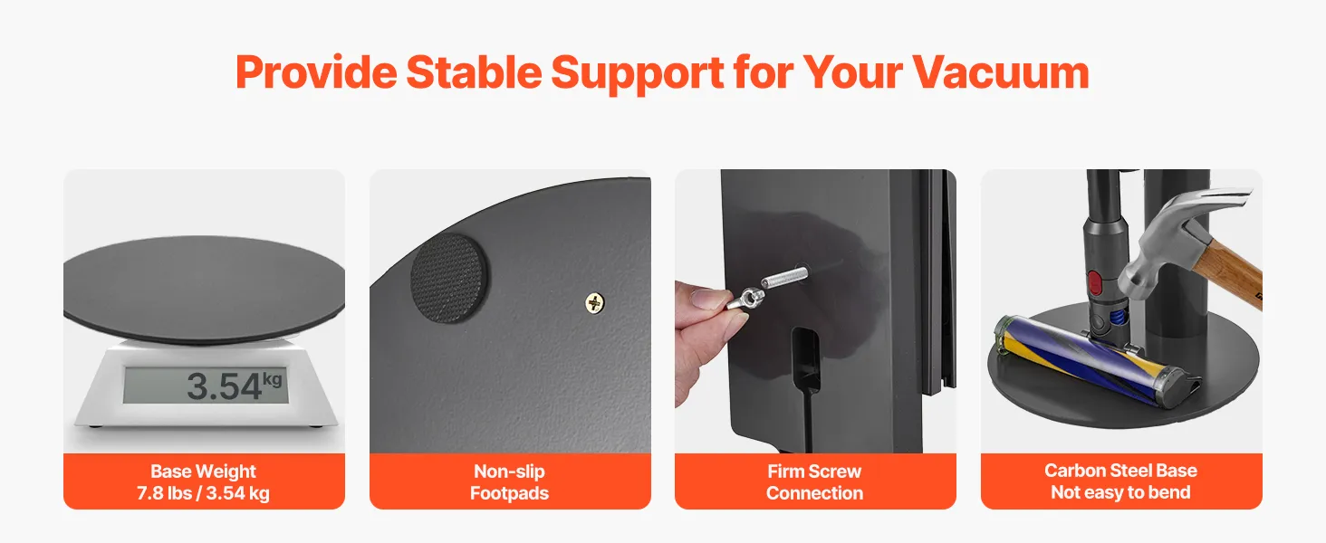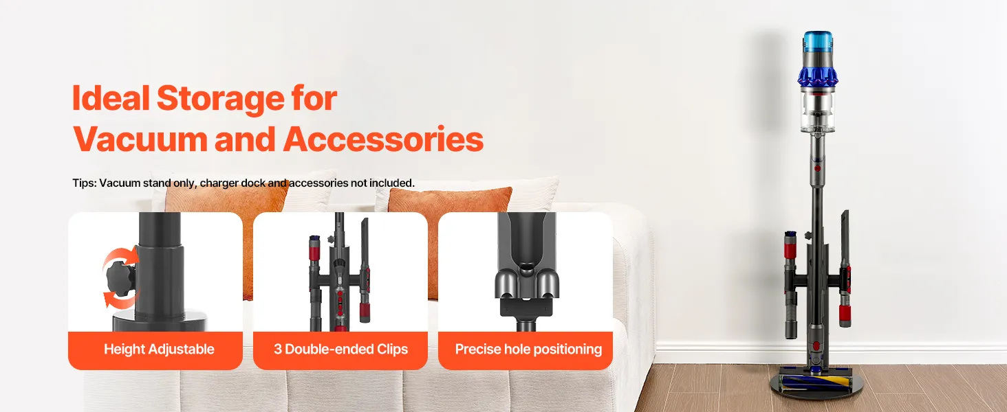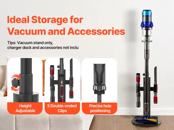 Stojak na odkurzacz jest regulowany za pomocą 3 klipsów i pasuje do różnych modeli. Solidna podstawa, rama ze stali węglowej i antypoślizgowe nóżki zapewniają stabilność, a otwór na kabel ułatwia utrzymanie porządku. Kompaktowy i łatwy w montażu, idealnie nadaje się do małych przestrzeni i nie wymaga wiercenia w ścianie.