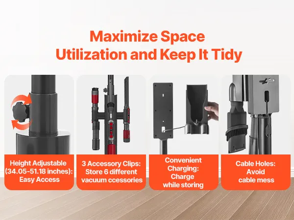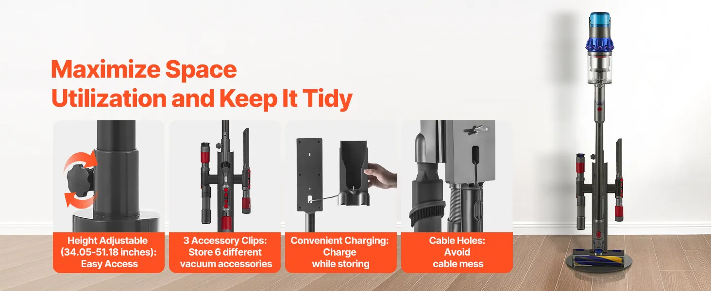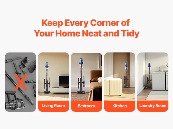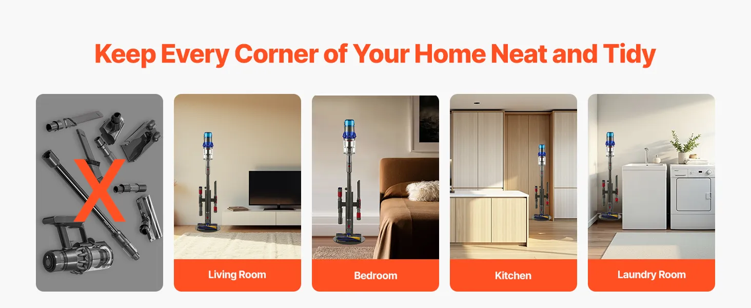 Niezależnie od tego, czy znajdujesz się w salonie, sypialni, kuchni czy pralni, ten stojak pomoże Ci uporządkować odkurzacz i akcesoria, zwolni miejsce na podłodze i stworzy wolną od bałaganu przestrzeń życiową, dzięki czemu Twój dom pozostanie uporządkowany.