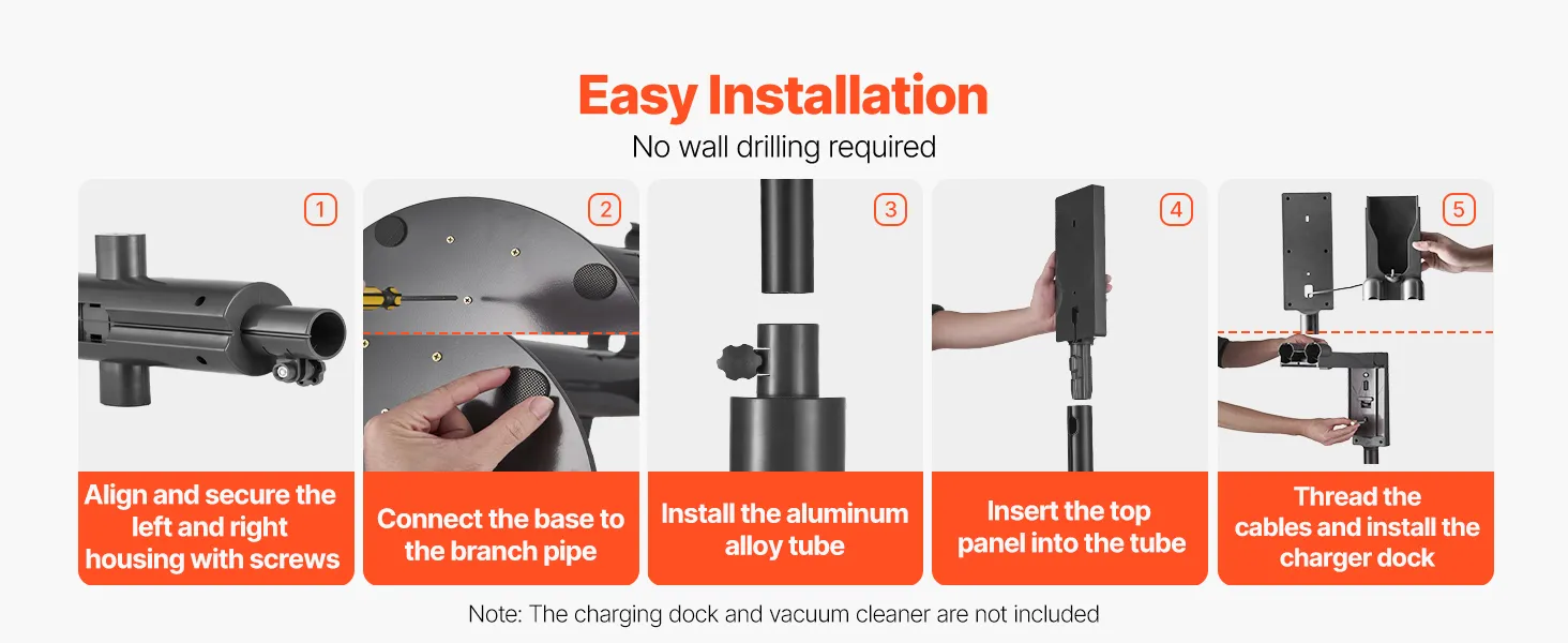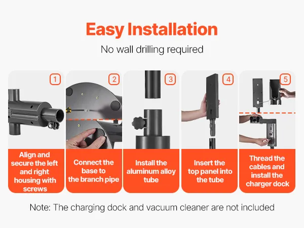 Wolnostojąca konstrukcja eliminuje potrzebę montażu na ścianie i umożliwia bezpieczne przechowywanie odkurzacza. Dzięki prostym krokom montażu podstawy, haków i płyty osłonowej możesz szybko i bez skomplikowanej instalacji ustawić produkt.