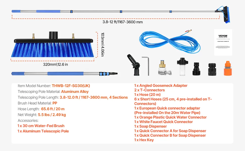 Kompletny zestaw akcesoriów: Zestaw szczotek do czyszczenia paneli słonecznych zawiera 20-metrowy wąż do łatwego podłączenia do źródła wody. Zestaw posiada wiele szybkozłączy do standardowych węży ogrodowych lub systemów czystej wody, dzięki czemu idealnie nadaje się jako szczotka do czyszczenia paneli słonecznych i drążek do użytku domowego i komercyjnego.