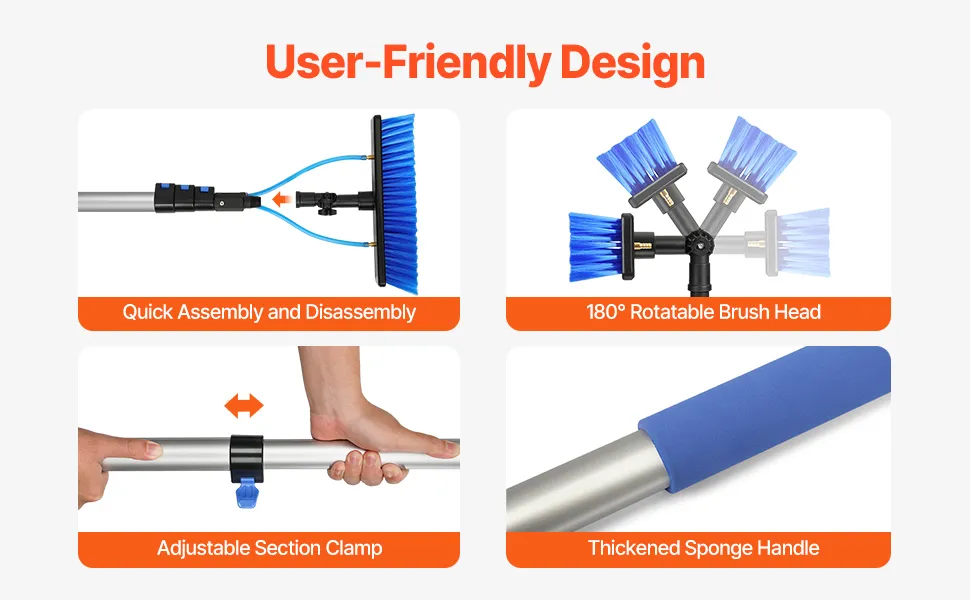 Ciesz się szybkim montażem i demontażem, obrotową głowicą szczotki o 180° i główką o szerokości 11,8 cala (29,7 cm) dla maksymalnego zasięgu. Pogrubiony uchwyt gąbkowy zapewnia wygodny chwyt i sprawia, że czyszczenie jest łatwiejsze i bardziej wydajne.
