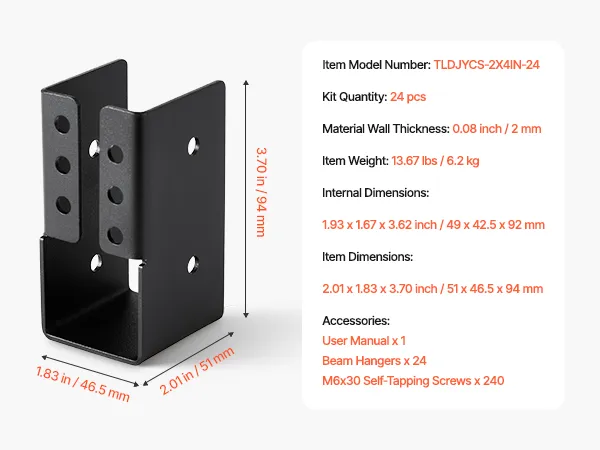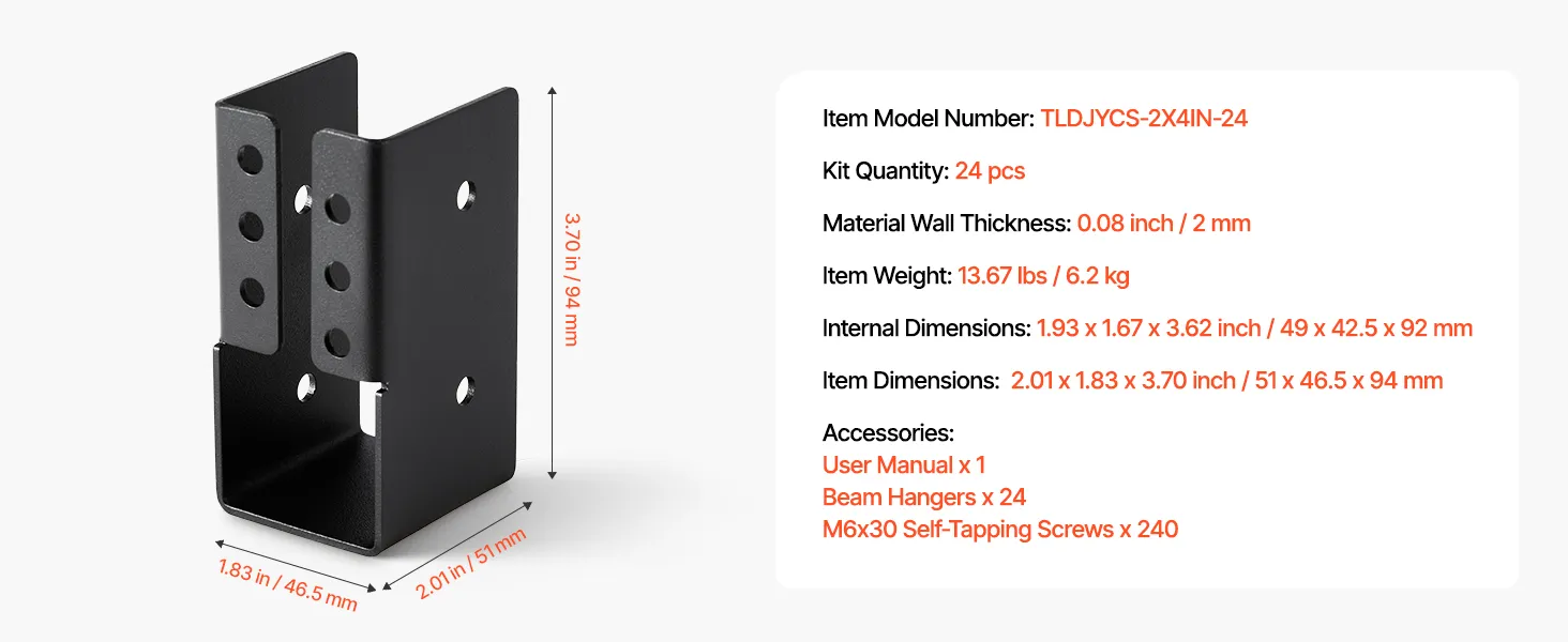 Wymiary i opakowanie: Nasze wsporniki belek 2x4 pasują do standardowego drewna o wymiarach 4,9 x 9,2 cm i 5,1 x 4,6 x 9,4 cm. Gwarantują ścisłe, bezpieczne dopasowanie i zwiększoną wytrzymałość. Zestaw zawiera 240 wkrętów samogwintujących M6 x 30 i 24 wsporniki. Nie wymaga dodatkowych części.
