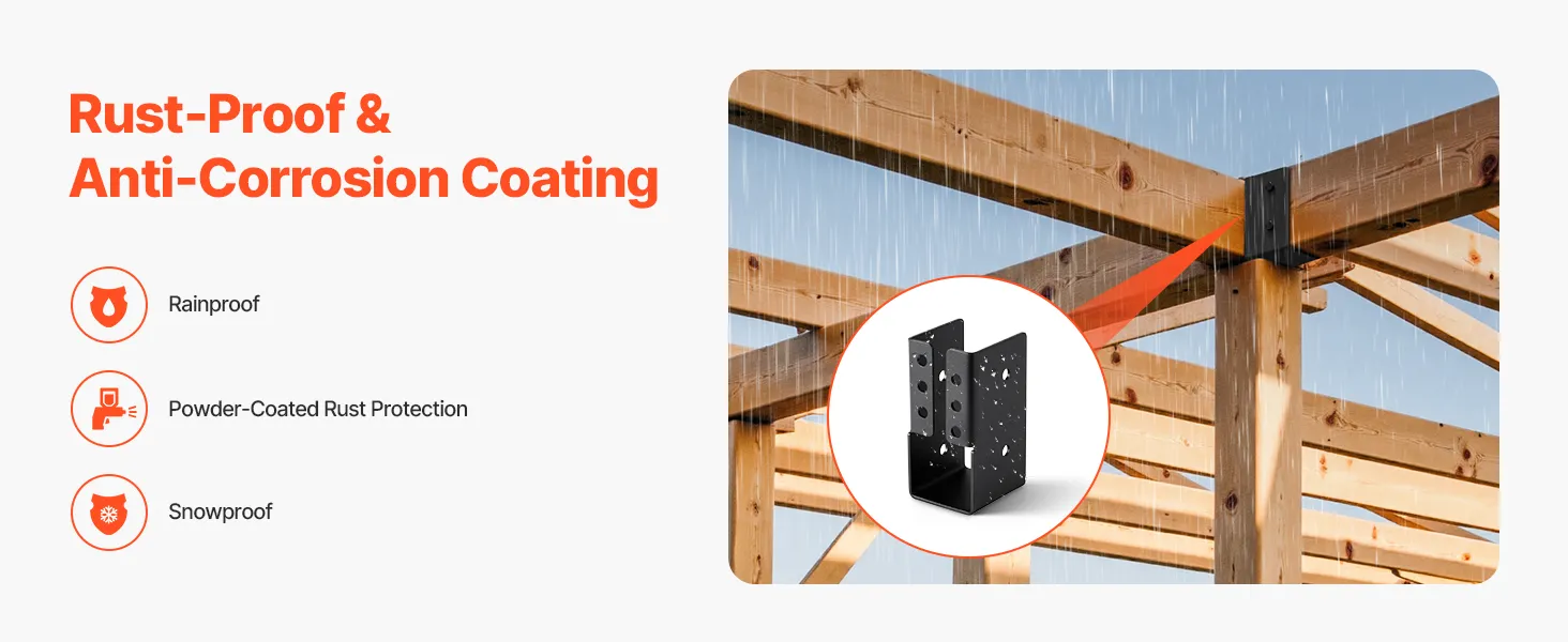 Nasze wsporniki belek zostały zaprojektowane specjalnie do użytku na zewnątrz i posiadają wysokiej jakości powłokę antykorozyjną, która wytrzymuje deszcz, śnieg i zmienne warunki pogodowe, nie rdzewiejąc ani nie osłabiając się.