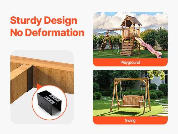 Wzmocniona konstrukcja nośna: Nasz wspornik belki z ukrytym kołnierzem charakteryzuje się wzmocnioną konstrukcją w kształcie litery L z czterostronnymi osłonami, co zapewnia doskonałą wytrzymałość i zapobiega skręcaniu się lub odkształcaniu belki. Jest niezawodny pod ciągłym obciążeniem, zapewniając stabilność i bezpieczeństwo huśtawek i placów zabaw, pozwalając na bezpieczną zabawę.