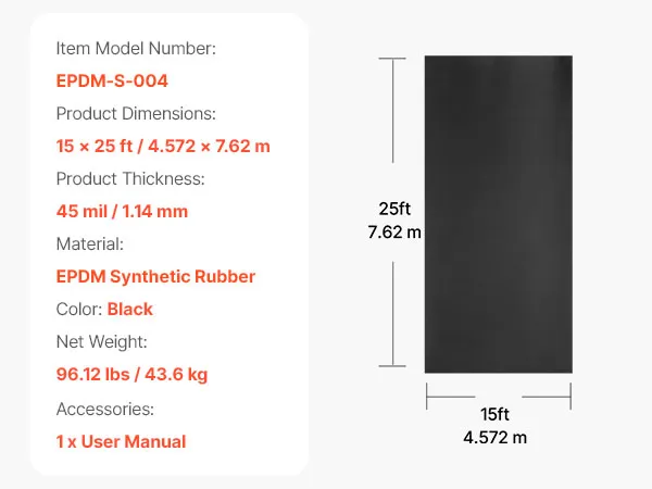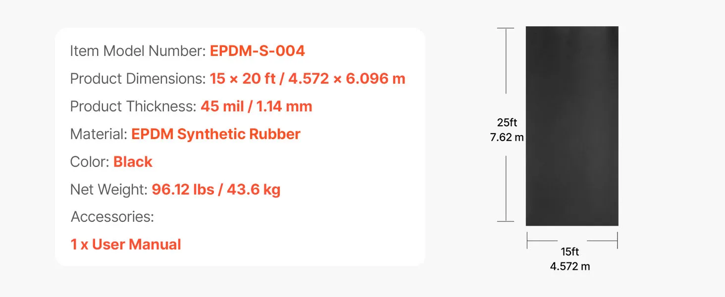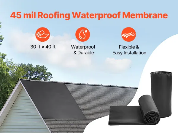 Membrana dachowa VEVOR, 4,572 x 7,62 m, membrana dachowa, folia EPDM o grubości 1,14 mm, hydroizolacja wiat samochodowych, trwała i odporna na warunki atmosferyczne, hydroizolacja dachów, podkład dachowy do kamperów, dachów, stawów