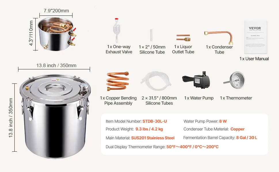 Zestaw do destylacji obejmuje beczkę fermentacyjną i pojemnik chłodzący, oba wykonane ze stali nierdzewnej dopuszczonej do kontaktu z żywnością, co zapewnia bezpieczny kontakt podczas całego procesu warzenia i destylacji, dzięki czemu produkt końcowy jest bezpieczny do picia.