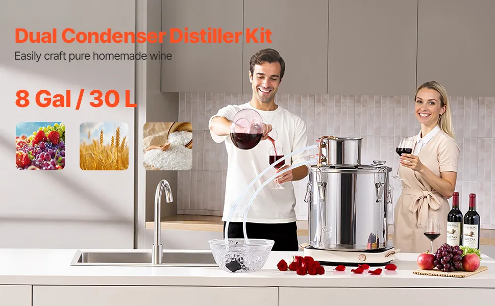 Szczerość i kunszt błyszczą! Ta destylarnia jest idealna dla początkujących, którzy chcą warzyć i produkować wina owocowe, rum, wódkę, wodę destylowaną i inne produkty destylowane w domu.
