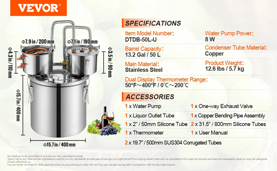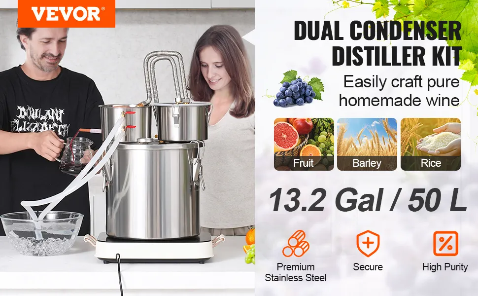 System destylacji alkoholu VEVOR, bimber, alembik, 50 l, system destylacji alkoholu wodnego do szybkiego chłodzenia, podwójny zestaw do destylacji skraplacza z destylacją wtórną, do wina, whisky, brandy, srebra