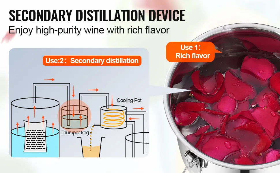 Ten prosty destylator jest idealny dla początkujących, którzy chcą w domu warzyć i produkować wino owocowe, rum, piwo, etanol, olejki eteryczne i inne produkty destylacyjne, aby wykazać się swoją szczerością i kunsztem podczas festiwali i uroczystości.