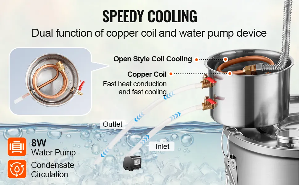 Szybkie i wydajne chłodzenie: Gładkie, pozbawione zagnieceń wnętrze rurek zapobiega gromadzeniu się pozostałości alkoholu destylowanego, wody i olejków eterycznych, hamuje rozwój bakterii i eliminuje posmak. Pompa wodna wspomaga cyrkulację wody chłodzącej, a zawory wlotowe i wylotowe kontrolują natężenie przepływu, zapewniając dokładne i wydajne chłodzenie.