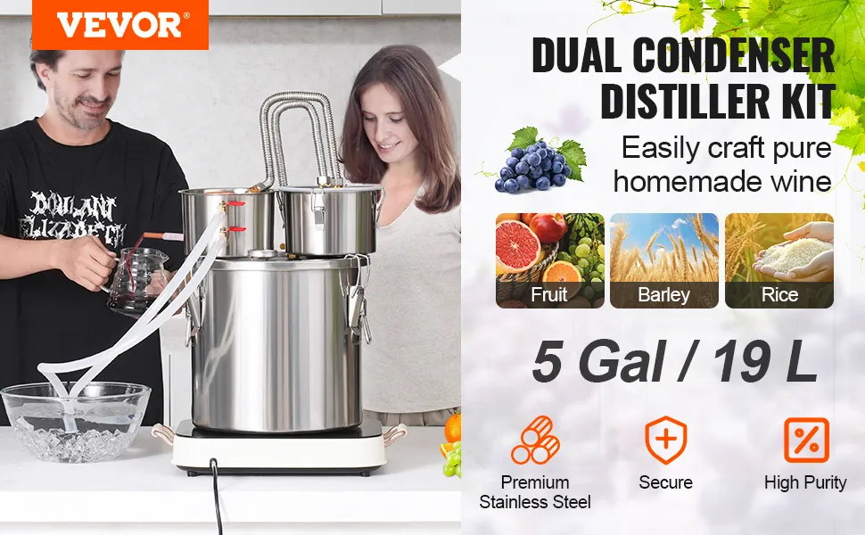 Zestaw destylacyjny 19 l z podwójnym skraplaczem: Oferujemy kompletny zestaw do tego destylatora wzbogacającego smak, idealnego do domowego warzenia win owocowych, whisky, brandy, szampanów, wódek, wody, etanolu, olejków eterycznych i innych produktów destylowanych. Główne elementy zestawu to beczka fermentacyjna, pokrywa beczki, naczynie chłodzące i beczka thumper.