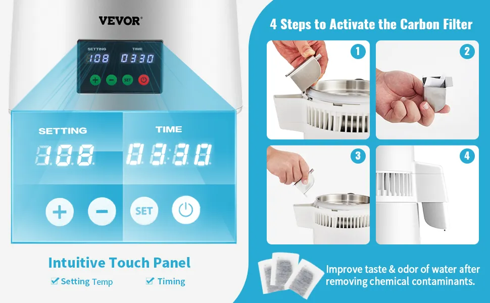 W zestawie znajduje się roczny zapas węgla aktywnego, dzięki czemu możesz cieszyć się pysznym smakiem wody przez wiele miesięcy. Nie musisz często kupować wkładów. Te wkłady filtracyjne działają po destylacji wody, zapewniając jej czystość, świeżość i idealną jakość do codziennego picia.