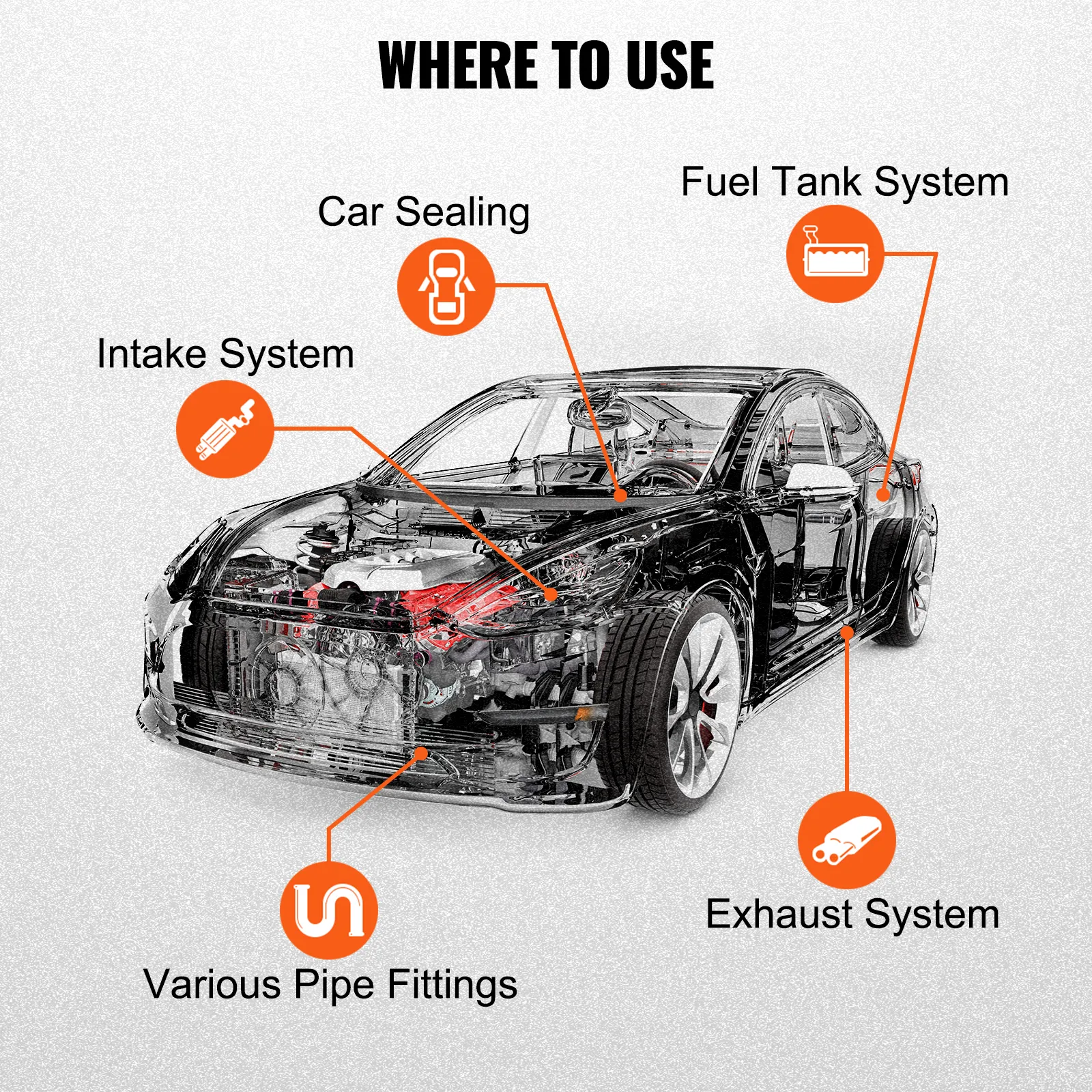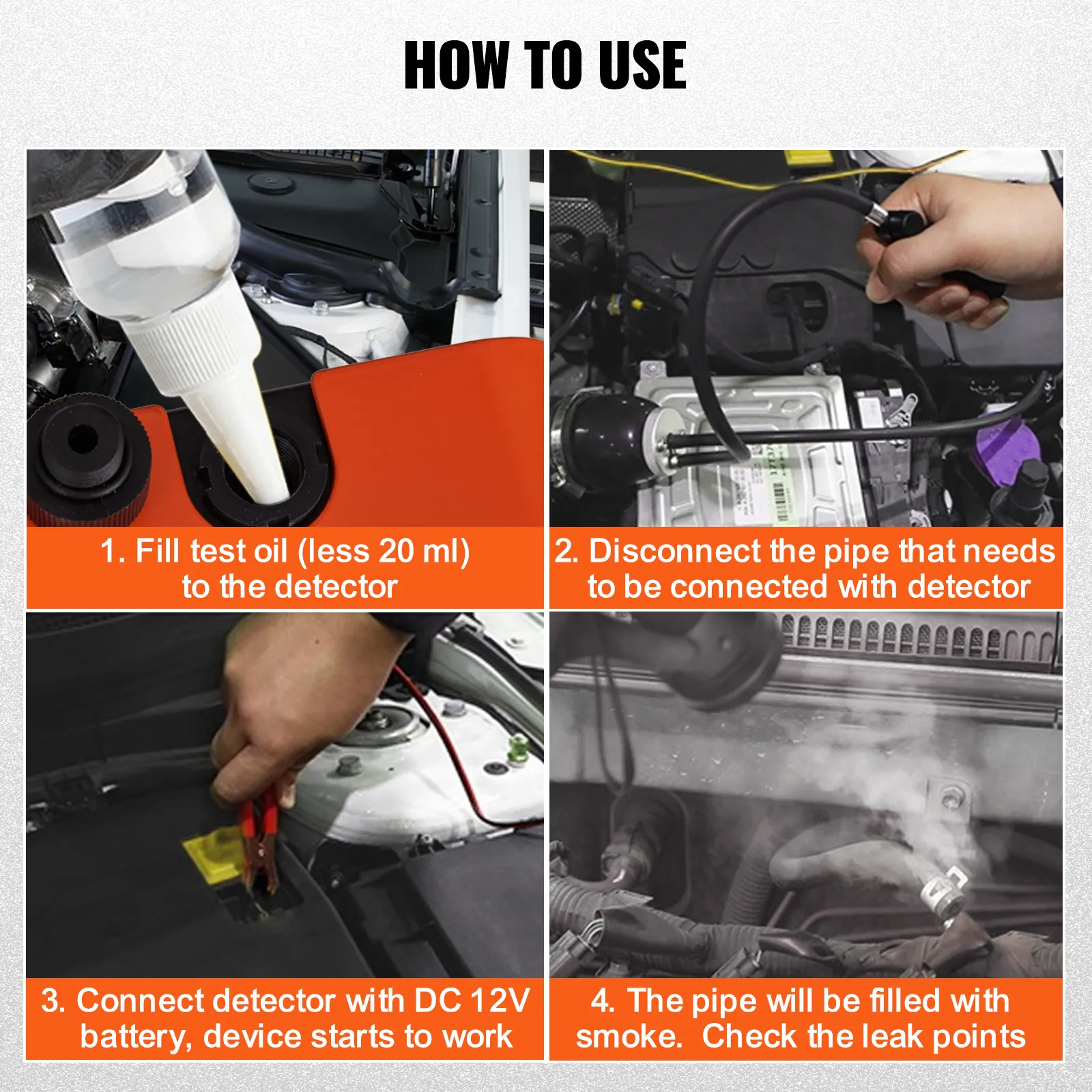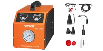 Detektor dymu VEVOR może przeprowadzać testy dymu wielu układów, w tym między innymi układu skrzyni korbowej, układu dolotowego, uszczelnień pojazdu, układu zbiornika paliwa, turbosprężarki, układu EVAP i układu wydechowego.