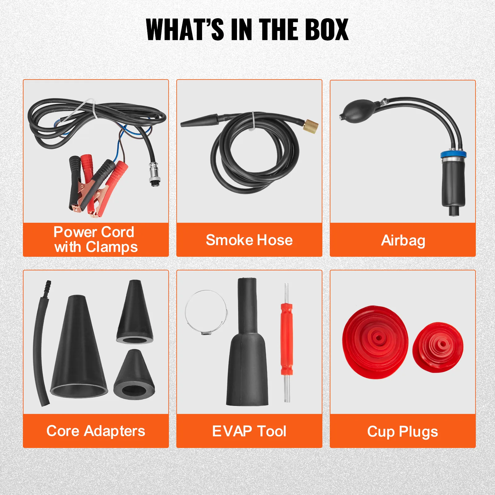 Pakiet zawiera 1 tester szczelności dymu, 1 rurkę dymową, 1 przewód zasilający, 1 uniwersalny adapter, 1 olej dymny, 1 złącze adaptera skrzyni korbowej, 1 klucz rdzeniowy do zaworów, 1 adapter stożkowy, 2 standardowe adaptery stożkowe, 1 hak i 1 zestaw instrukcji .