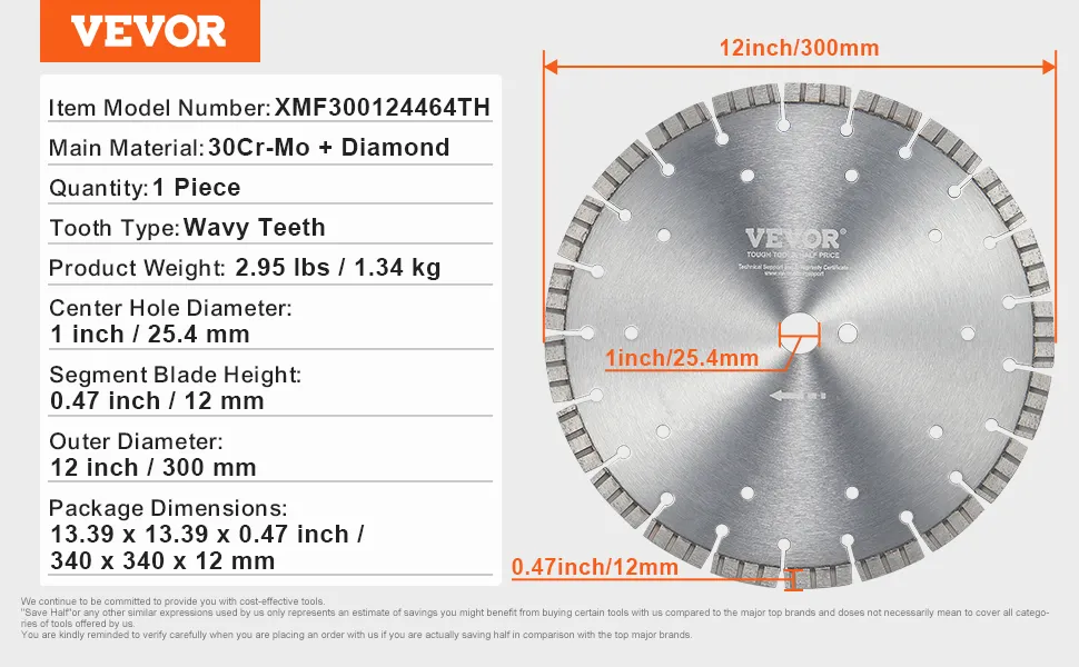 Tarcza diamentowa VEVOR, 12 cali/300 mm, do cięcia betonu na mokro i sucho, zęby faliste 0,47 cala/12 mm, diamentowa tarcza segmentowa, uniwersalna średnica otworu centralnego 1 cal/25,4 mm, do betonu, płyt cementowych, płytek, cegły