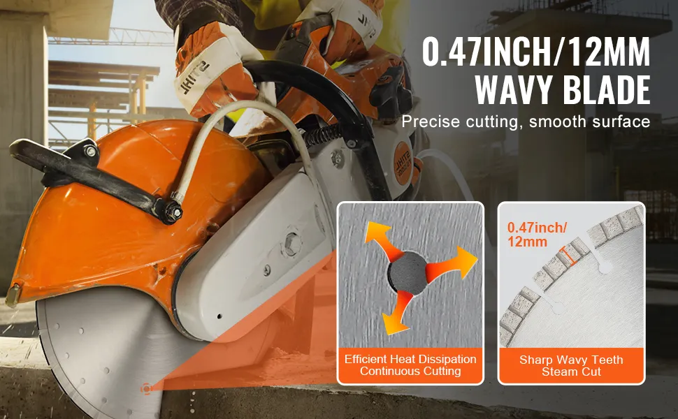 Ostre cięcie i dobre odprowadzanie ciepła: Drobno ząbkowane zęby zapewniają większą ostrość, równomierne usuwanie wiórów i czyste cięcie bez zadziorów. Segmenty szersze o 0,47 cala (ok. 12 mm) zwiększają trwałość i spełniają profesjonalne wymagania dotyczące cięcia. Dodatkowe otwory w podstawie poprawiają odprowadzanie ciepła i umożliwiają dłuższe, ciągłe cięcie, idealne do codziennego użytku.