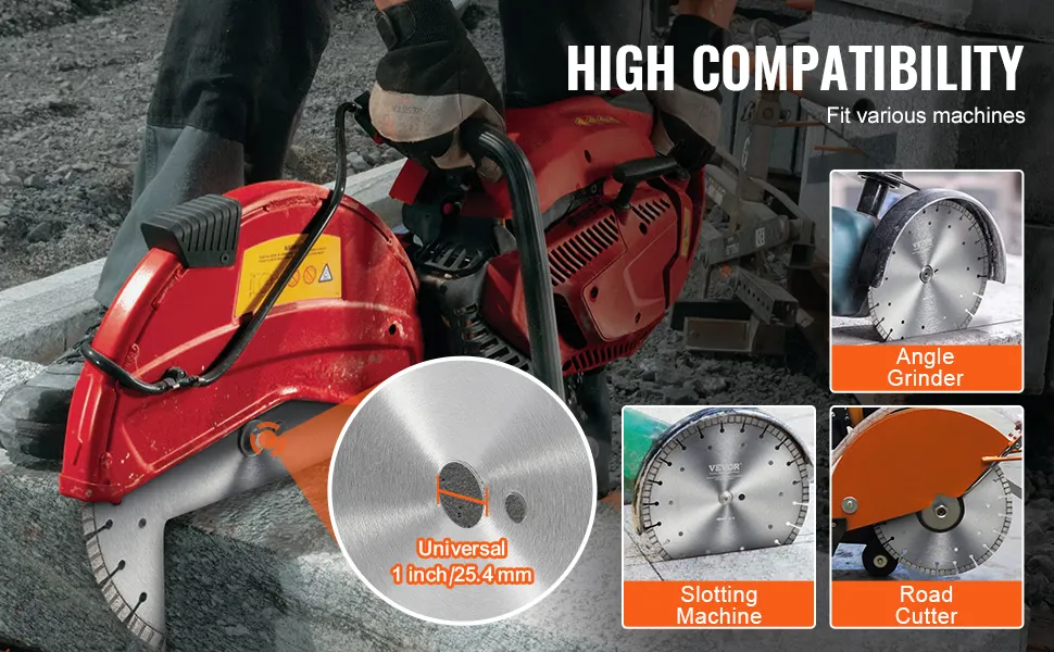 Diamentowa tarcza tnąca do betonu posiada uniwersalny otwór o średnicy 25,4 mm, dzięki czemu jest kompatybilna z większością maszyn dostępnych na rynku. Niezależnie od tego, czy chodzi o frezowanie odpływów drogowych na placach budowy, czy cięcie płytek podczas codziennych napraw, jest łatwa w adaptacji.