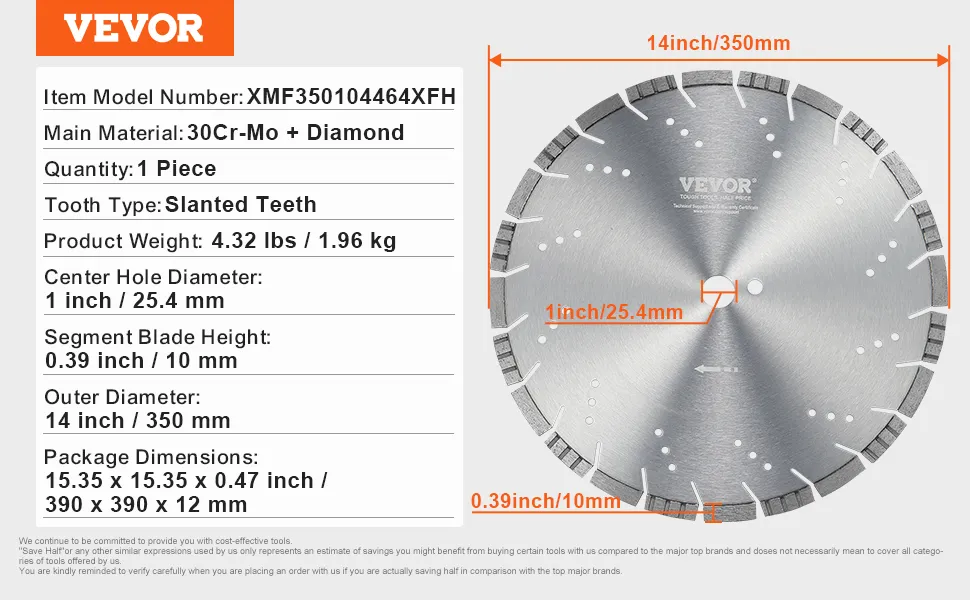Tarcza diamentowa VEVOR, 14 cali/350 mm, do cięcia betonu, do pracy na mokro i na sucho, 0,39 cala/10 mm, diamentowa tarcza tnąca z segmentami i zębami skośnymi, uniwersalna średnica otworu centralnego 1 cal/25,4 mm, do betonu, płyt cementowych, płytek, cegieł