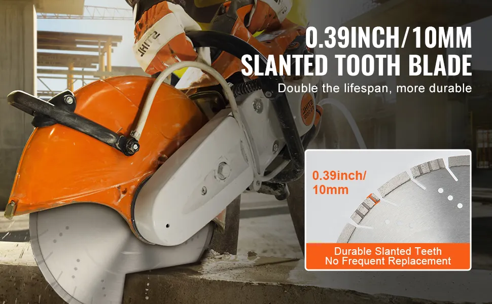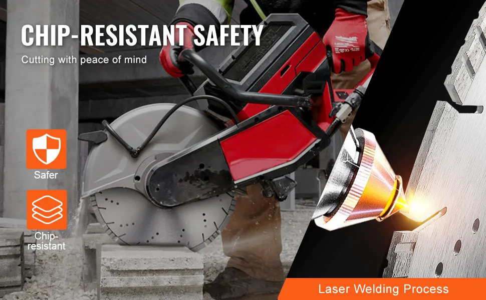 Bezpieczna i odporna na uszkodzenia zębów: Segmenty diamentowe tarczy tnącej do betonu są przyspawane laserowo do korpusu tarczy, tworząc zintegrowaną tarczę tnącą, która skutecznie zapobiega uszkodzeniom lub łamaniu zębów podczas cięcia, a tym samym znacznie zwiększa bezpieczeństwo użytkownika.