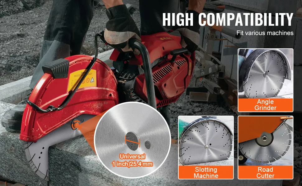 Kompatybilny z różnymi maszynami: Ta tarcza do cięcia kamienia ma uniwersalny otwór montażowy o średnicy 1 cala i pasuje do szlifierek kątowych, maszyn do cięcia kamienia, sprzętu drogowego i innego sprzętu profesjonalnego. Niezależnie od tego, czy jesteś budowlańcem, glazurnikiem, dekarzem, czy majsterkowiczem, ta diamentowa tarcza tnąca to idealny wybór.