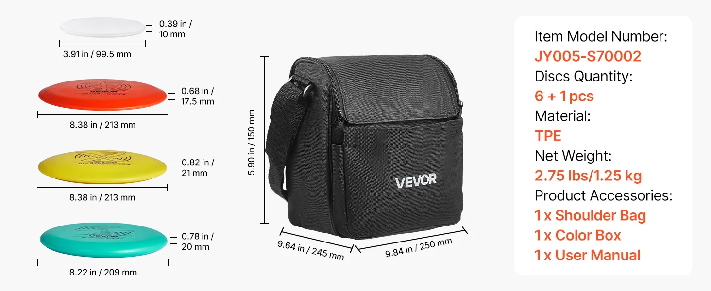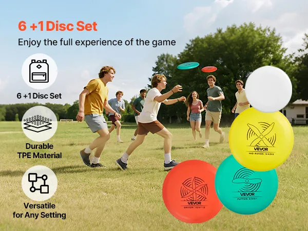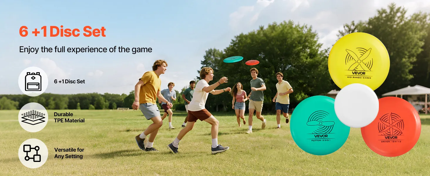 Zestaw do disc golfa VEVOR (6 + 1 szt.) dla początkujących, zestaw startowy z putterem, średni zasięg, driver, w tym mini marker, przenośny plecak, do ogrodu, na trawnik, plażę i do parku, na zewnątrz.