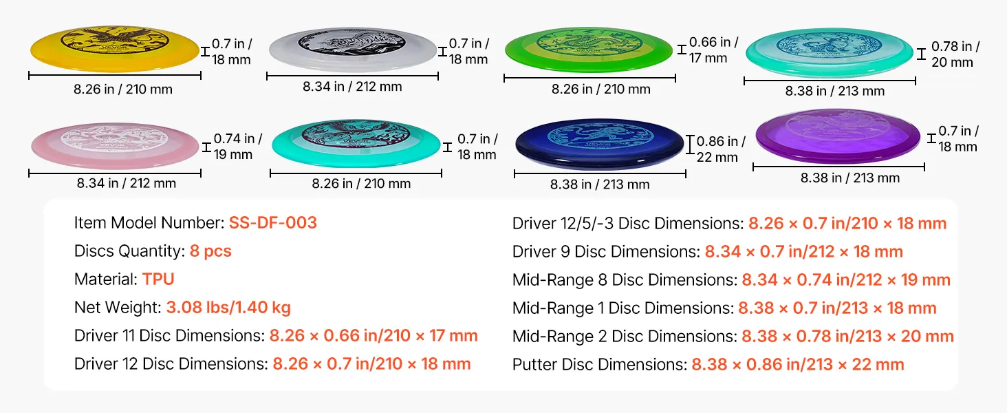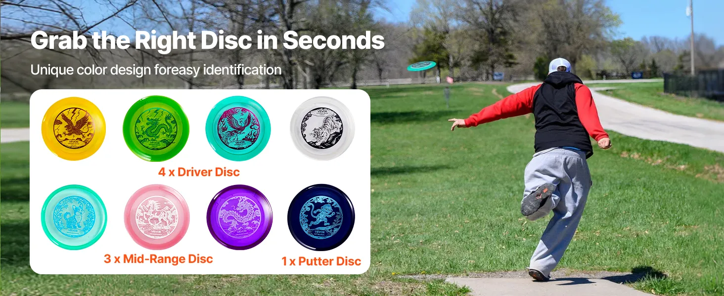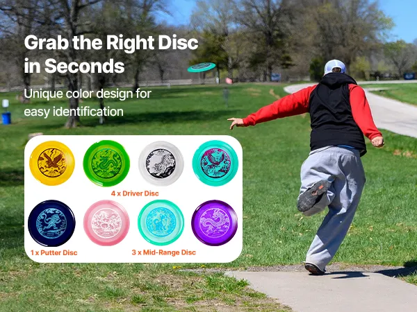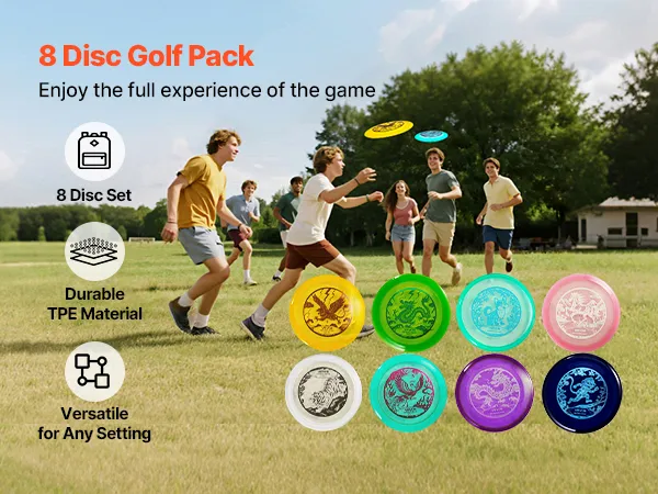 8 dysków, wszystko, czego potrzebujesz do gry: Ten zestaw do disc golfa zawiera 8 starannie zaprojektowanych dysków. Początkujący mogą łatwo rozpocząć grę i cieszyć się zabawą w disc golfa, a zaawansowani gracze mogą doskonalić swoje umiejętności i zdobywać doświadczenie w bardziej precyzyjnych rzutach.