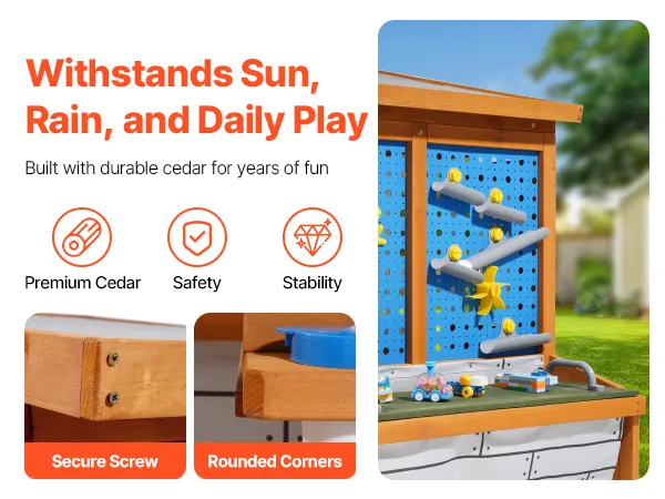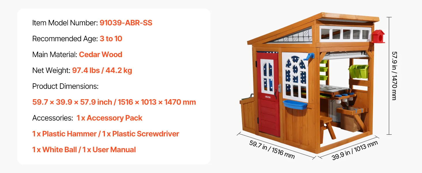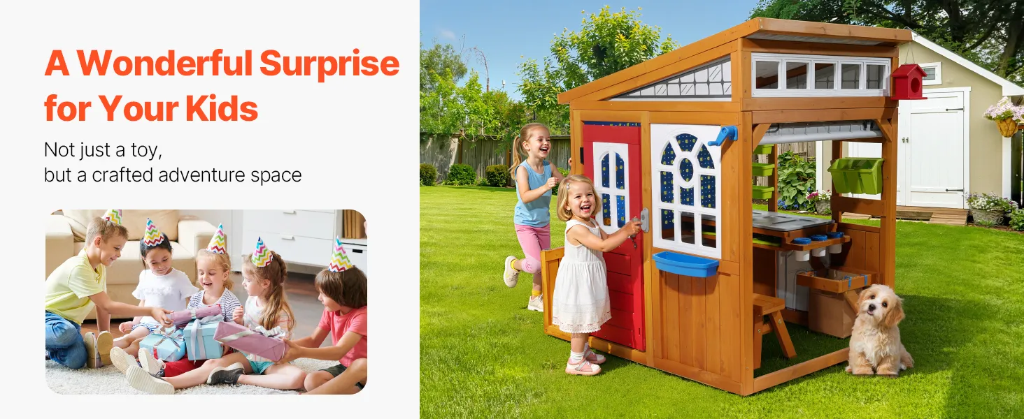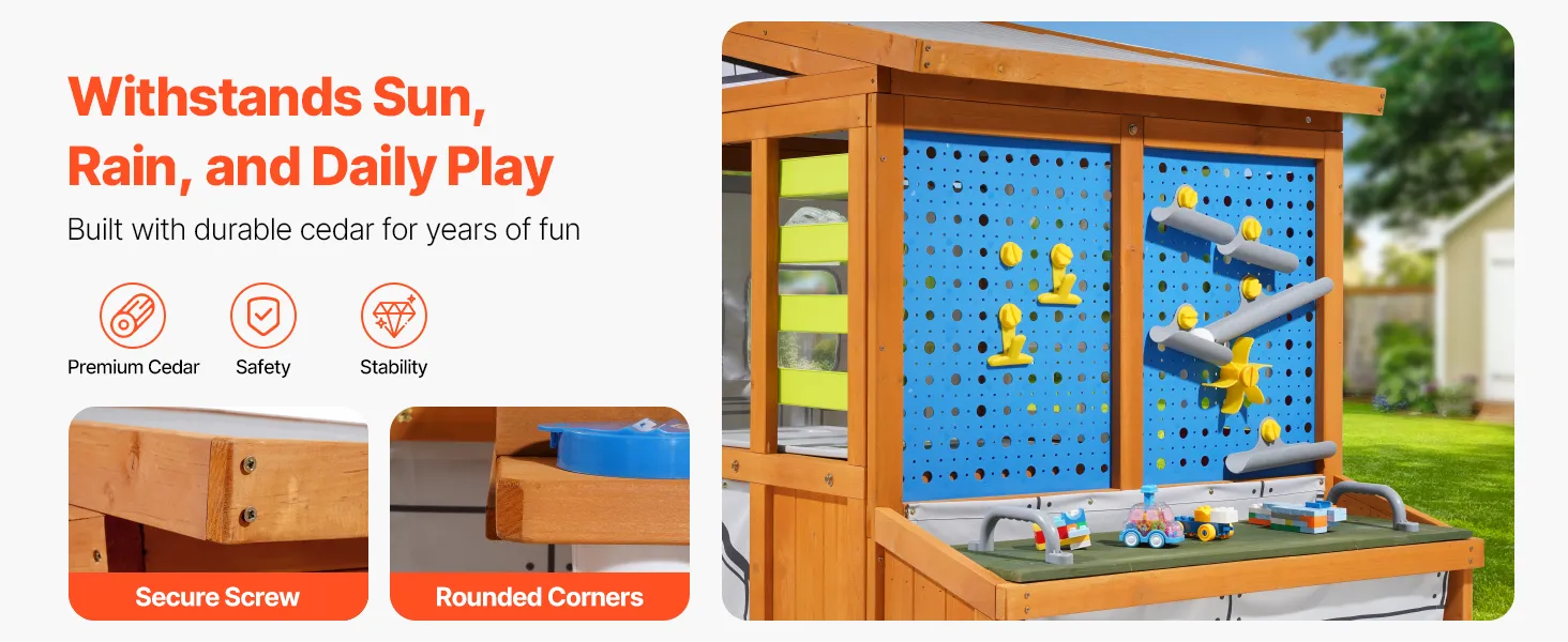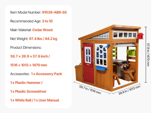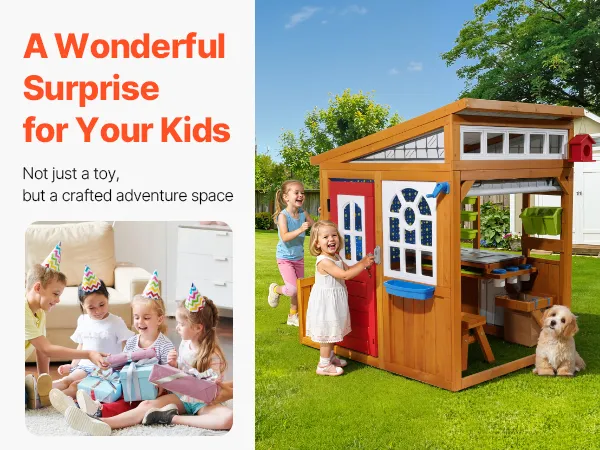Podaruj kreatywny prezent z tym domkiem zabaw VEVOR dla dzieci wykonanym z drewna cedrowego. Odpowiedni na każdą porę roku i dla dzieci w wieku od 3 do 10 lat, oferuje niekończącą się zabawę. Pomaga dzieciom odkrywać świat, odgrywać role i tworzyć trwałe wspomnienia, które będą im towarzyszyć w dorastaniu.