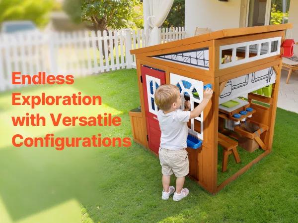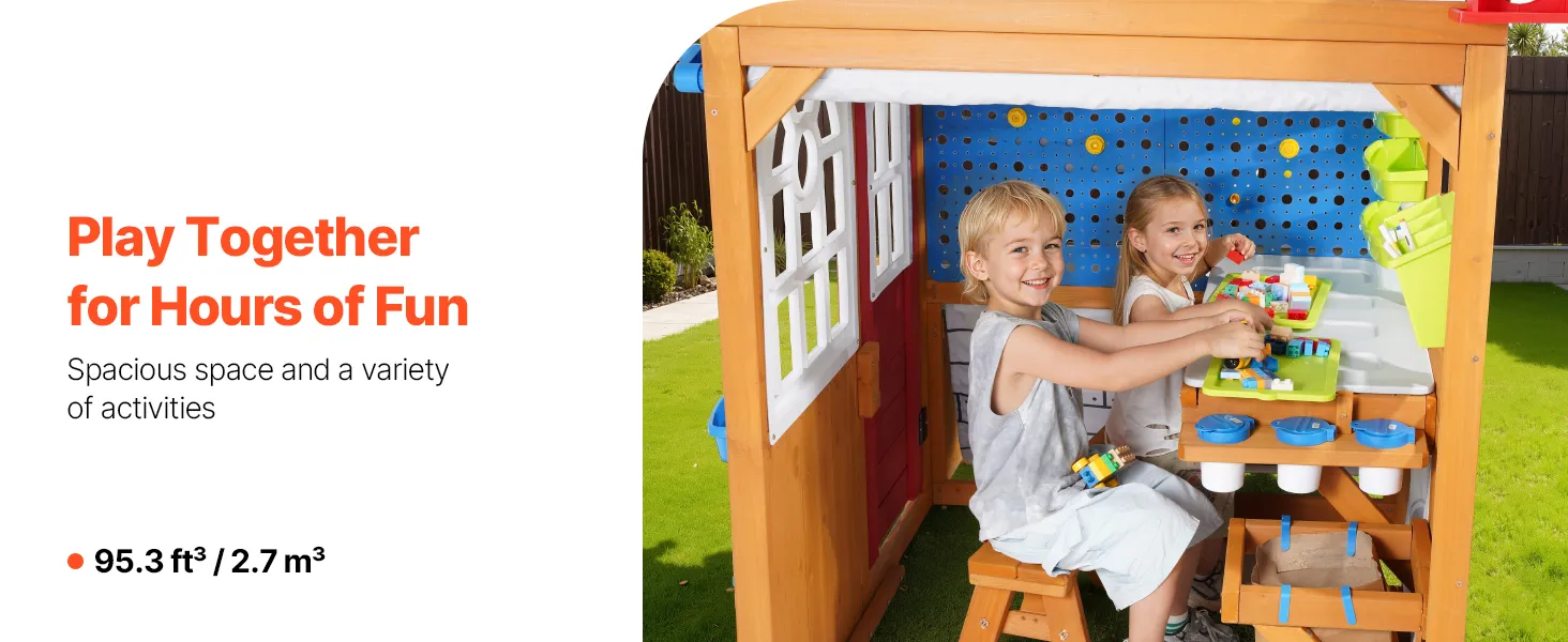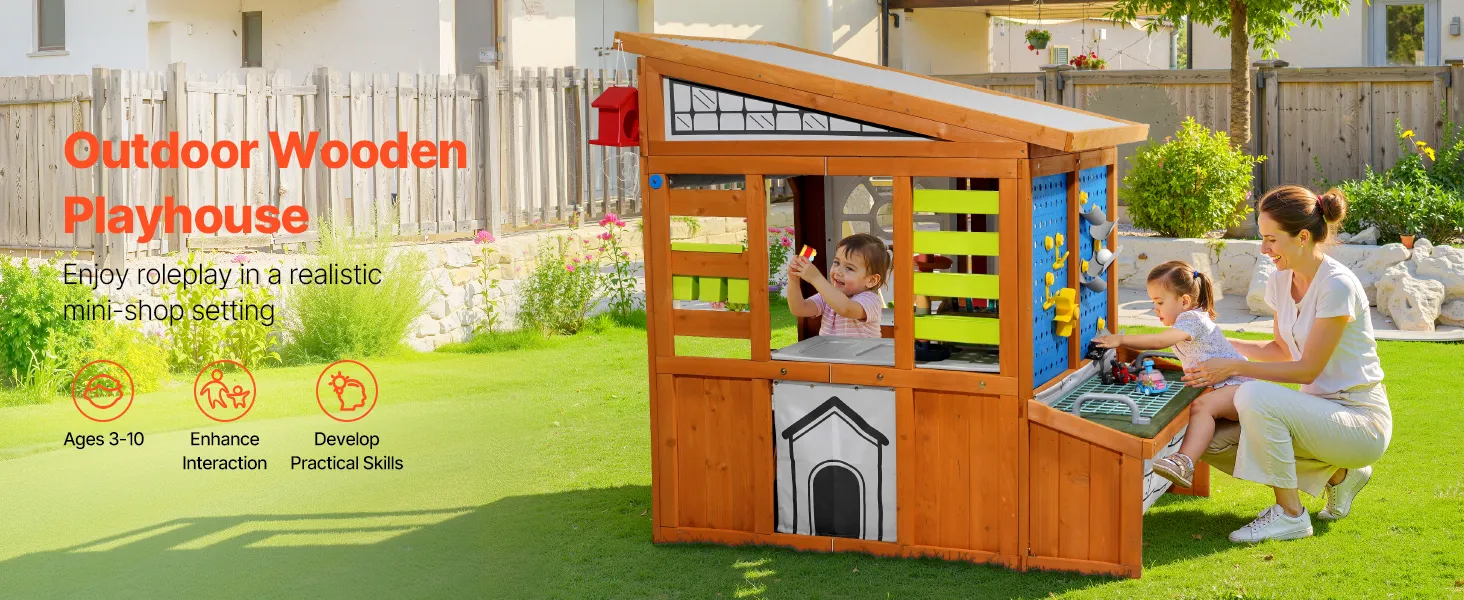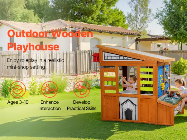 Nasz drewniany domek do zabawy na świeżym powietrzu został zaprojektowany dla dzieci w wieku od 3 do 10 lat i wyposażony jest w elektroniczny dzwonek, stół warsztatowy oraz drzwiczki dla zwierząt, tworząc w pełni interaktywny mini-domek. Dzieci mogą odkrywać, bawić się i rozwijać swoje umiejętności społeczne, kreatywne i motoryczne, ciesząc się niekończącymi się przygodami na podwórku.