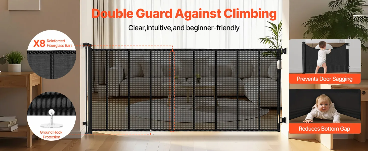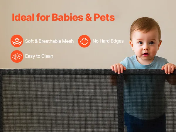 Bezpieczne oddzielenie bez ograniczania widoczności: Rozkładana bramka bezpieczeństwa wykonana jest z wytrzymałej siatki z tworzywa PVC dla dzieci, która jest miękka w dotyku, oddychająca i przezroczysta, dzięki czemu możesz monitorować swoje dziecko lub zwierzę z odległości, tworząc jednocześnie bezpieczną barierę