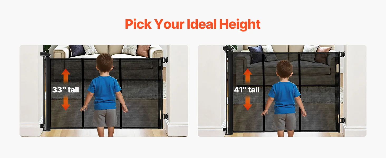 Bardzo szeroka konstrukcja: Ta rozsuwana bramka dla dzieci ma szerokość do 410 cm i wysokość 99 cm – idealna do szerokich drzwi, schodów, tarasów i otwartych przestrzeni. W kilka sekund tworzy bezpieczne strefy dla zwierząt domowych lub małych dzieci.