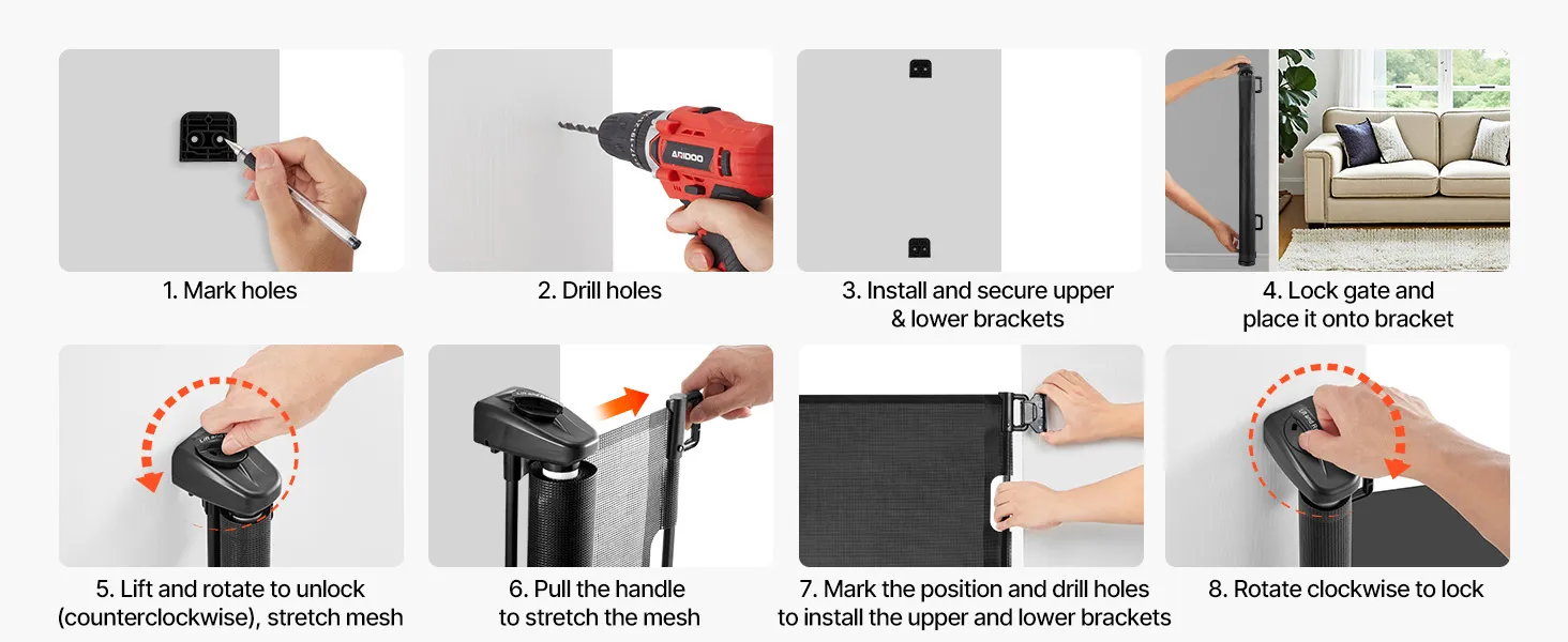 Stabilna i zabezpieczona przed ucieczką: Rozkładana bramka zabezpieczająca posiada osiem zintegrowanych pasów z włókna szklanego, które utrzymują ją w pozycji pionowej, a haki podłogowe uniemożliwiają dostęp dzieciom lub zwierzętom. Górny przycisk odblokowuje się poprzez naciśnięcie i przekręcenie – łatwe dla dorosłych, trudne dla dzieci.