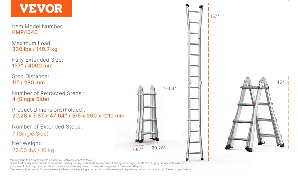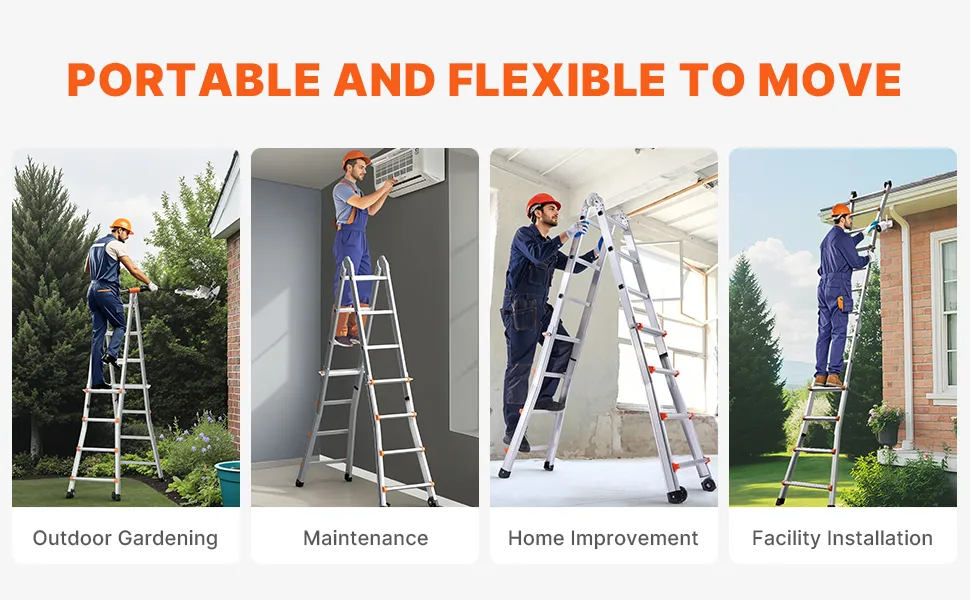Ta wszechstronna drabina rozsuwana w kształcie litery A może być rozkładana i składana w wielu konfiguracjach, dzięki czemu nadaje się do różnych zastosowań. Nogi skierowane na zewnątrz zapewniają lepszą stabilność i przyczepność i nie wymagają montażu.