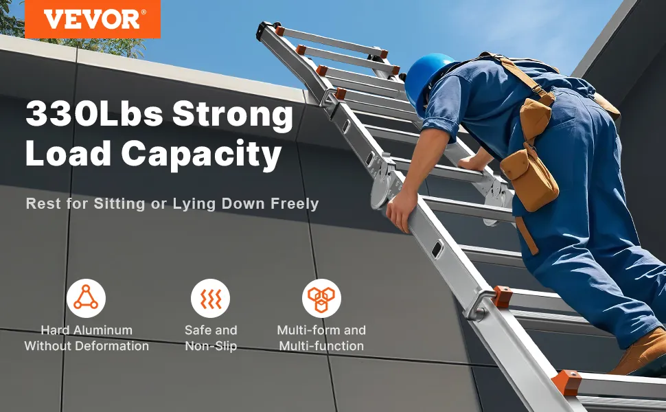 Bezpieczna drabina A-Frame: Ta drabina rozsuwana ma konstrukcję A-Frame dla lepszej stabilności i wytrzymuje obciążenie do 149,7 kg (330 funtów). Nie wymaga montażu, więc jest gotowa do użycia od razu po wyjęciu z pudełka. Antypoślizgowa konstrukcja zapewnia bezpieczną pracę na wysokości.