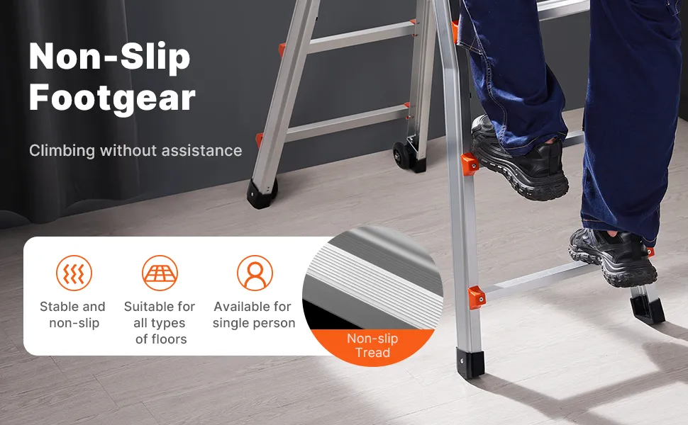 Wyposażona w antypoślizgowe nakładki na stopy, drabina pozostaje stabilna na różnych powierzchniach, chroniąc podłogę i zapobiegając poślizgowi, nawet gdy jest używana sama.