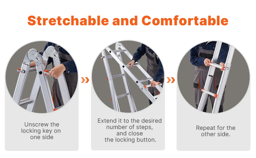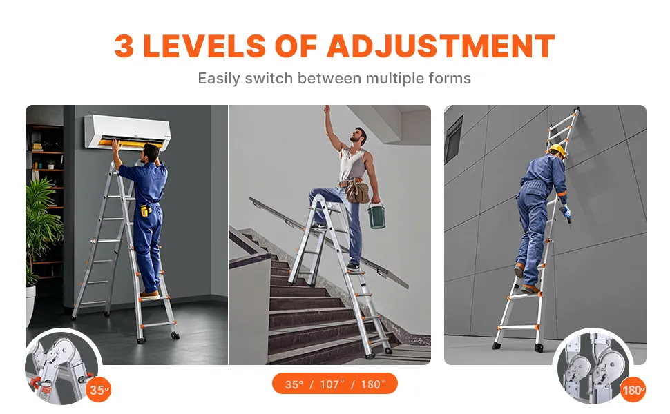 Wielofunkcyjna drabina rozsuwana w kształcie litery A wyposażona jest w unikalną konstrukcję zawiasu, która umożliwia łatwą zmianę kąta nachylenia drabiny: 35°, 107° i 180°, dostosowując ją do różnych wymagań dotyczących wysokości.
