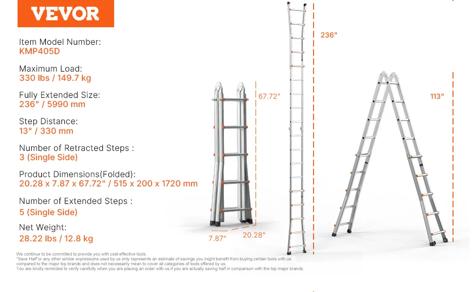 Wszechstronna drabina: Ta rozsuwana drabina ramowa dopasowuje się do różnych potrzeb i łatwo zmienia konfigurację. Dzięki nóżkom wysuwanym do 180° i maksymalnej wysokości 5990 mm (236 cali) idealnie nadaje się do prac konserwacyjnych lub czyszczenia strychów.