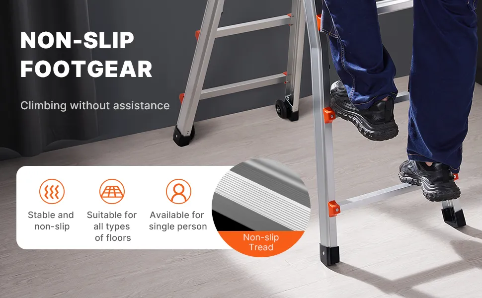 Wyposażona w antypoślizgowe nakładki na stopy, drabina pozostaje stabilna na różnych powierzchniach, chroniąc podłogę i zapobiegając poślizgowi, nawet gdy jest używana sama.