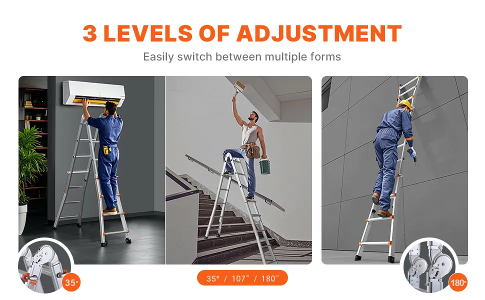 Wielofunkcyjna drabina rozsuwana w kształcie litery A wyposażona jest w unikalną konstrukcję zawiasu, która umożliwia łatwą zmianę kąta nachylenia drabiny: 35°, 107° i 180°, dostosowując ją do różnych wymagań dotyczących wysokości.